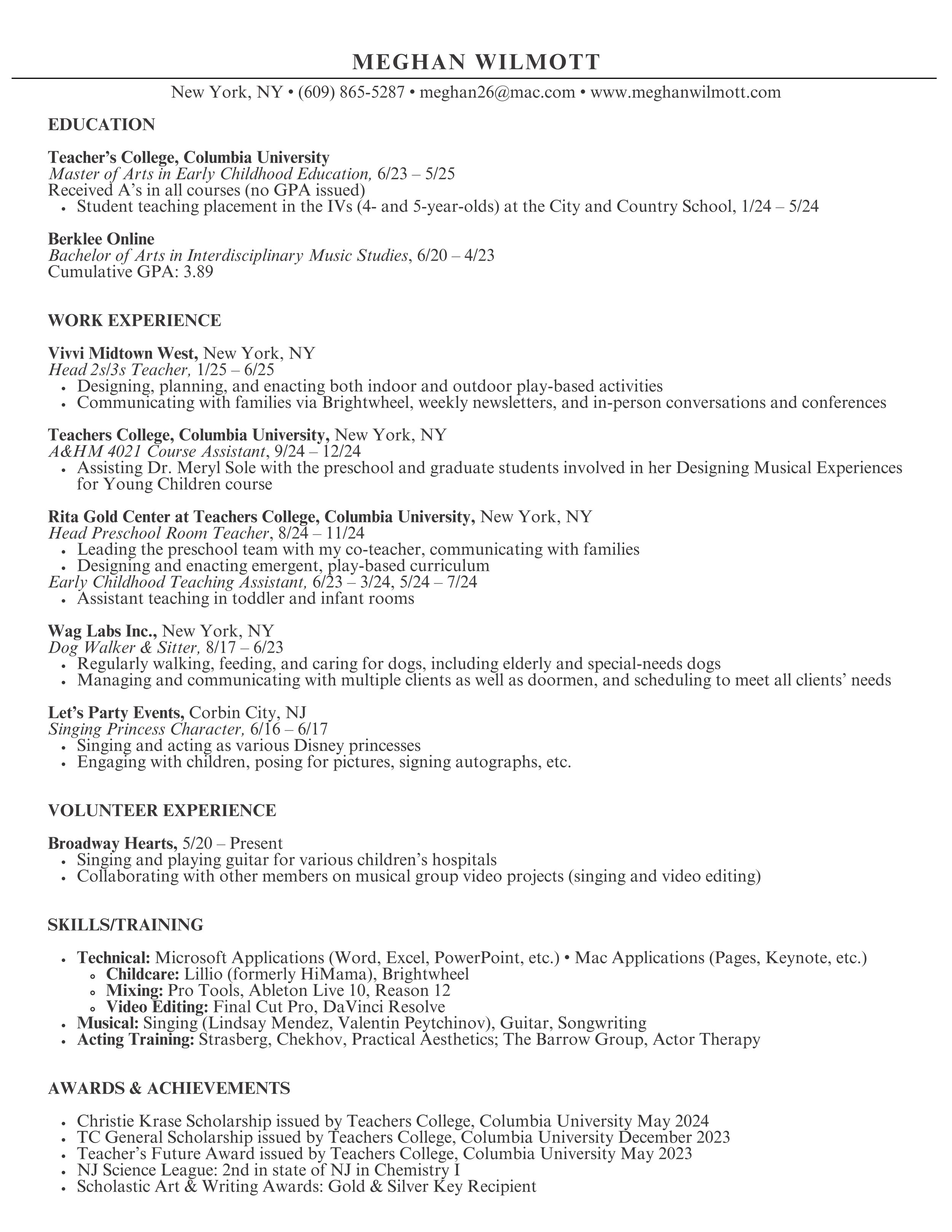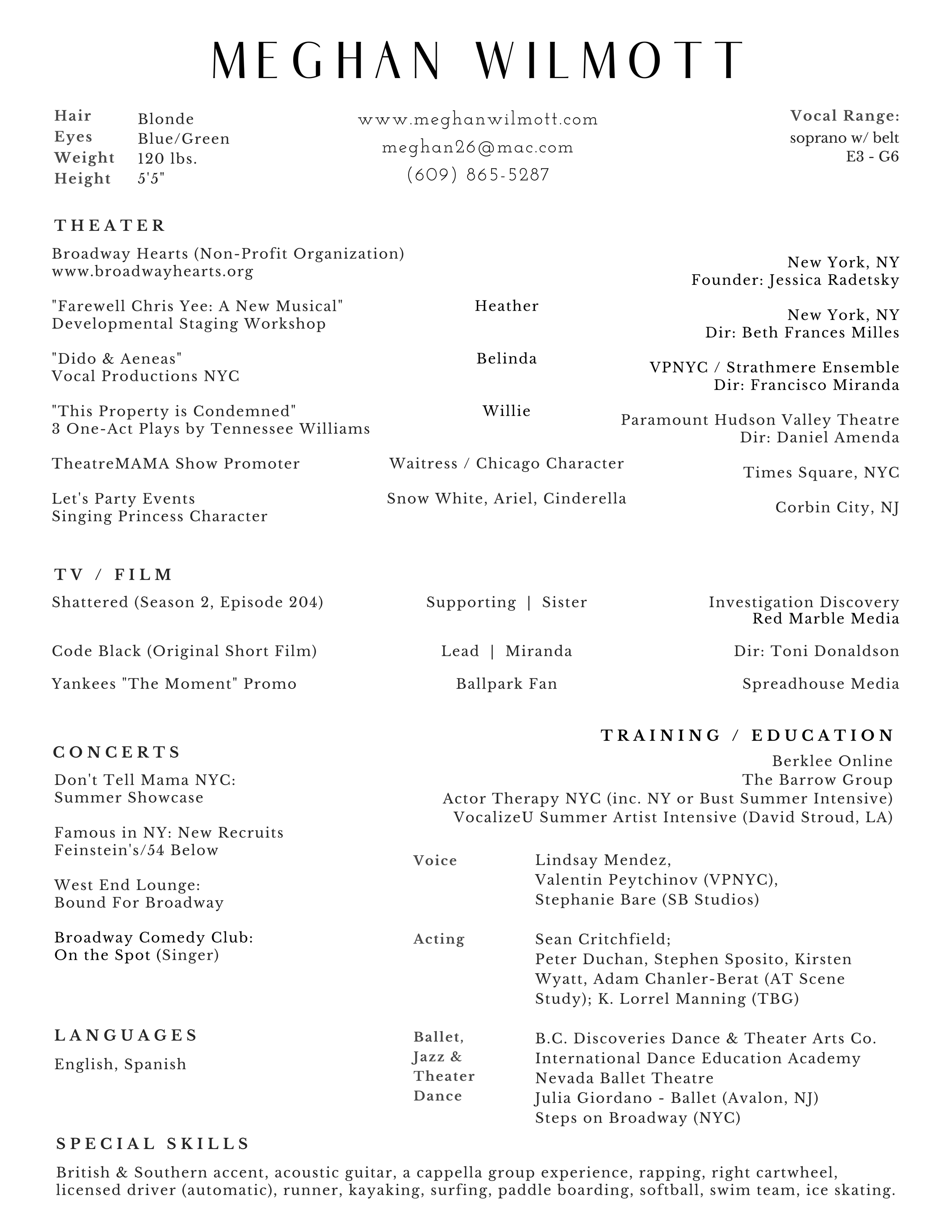 Scroll down to view Meghan Wilmott’s resume & performance resume ↓